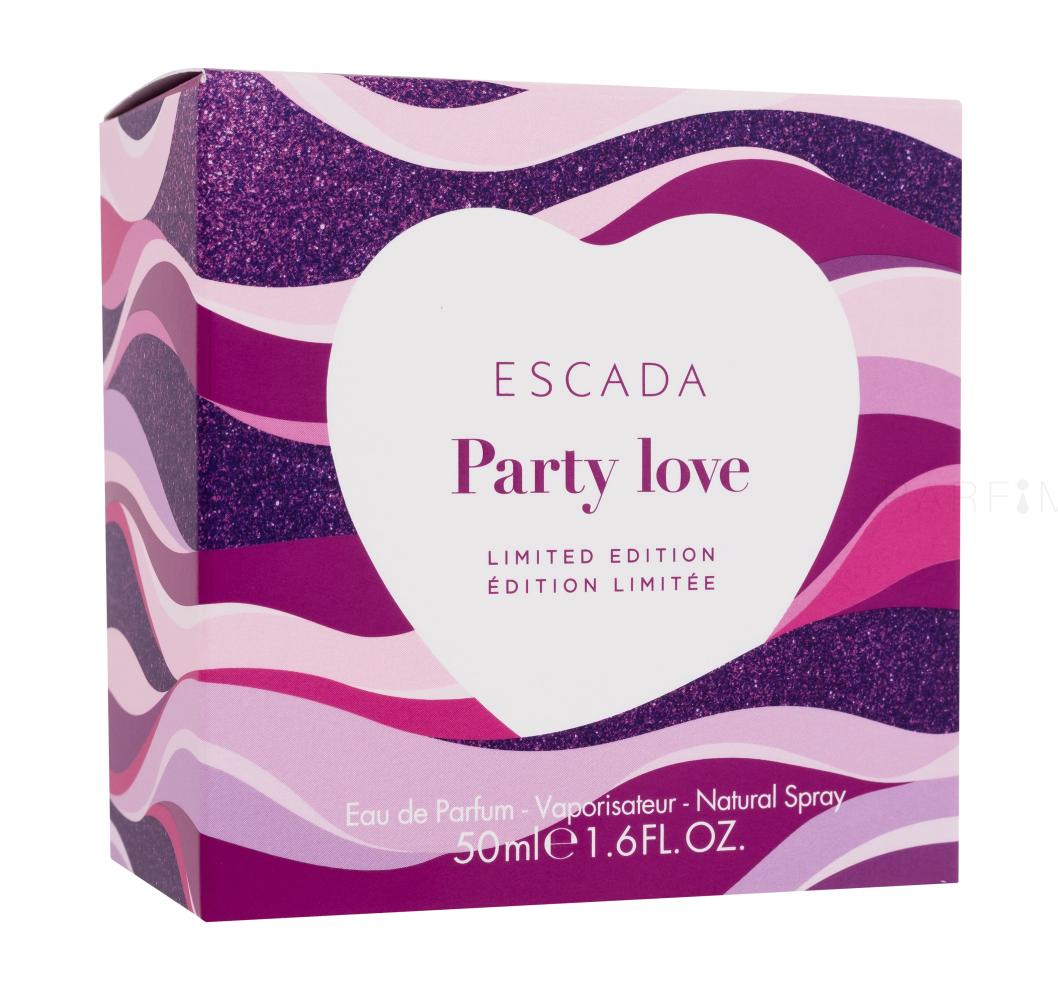 A mókás szívecskés ESCADA Love illatokat eddig a pirosan tündöklő alma, a szikrázó nashi körte és a fekete áfonyás macaron képviselte. Mindegyik tele van vidámsággal, fiatalos bájjal és édességgel, ami az ilyen jellegű illatok szerelmeseinek nagy örömet tud okozni. A figyelméért hajlong az ESCADA Party Love Limited Edition eau de parfum is, melynek elbűvölő cseresznyeszínű és lila, szív alakú parfümös üvege van.