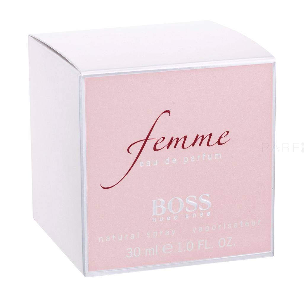 A HUGO BOSS Femme Eau de Parfum (2006) a nőiesség, szépség, törékenység és gyengédség ódája. Rendkívül romantikus és optimista töltetű. Annak a nőnek szól, aki mer álmodozni, és aki a nőiesség megtestesítője minden férfi számára. Az Eau de Parfum elragadó virágos-gyümölcsös illatjegyekkel bír, és olyan utakra terel, amelyek révén az álmok közelebb kerülnek a valósághoz... A naponta viselhető illat rózsaszín köntösben kapható, és azonnal hat az érzékekre.
